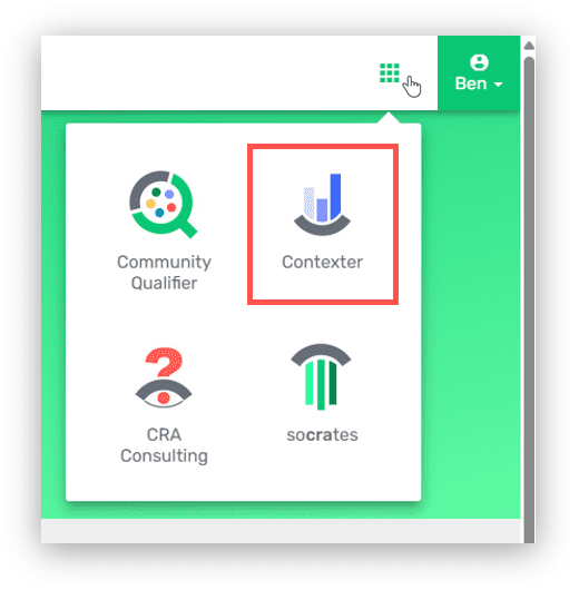 NOTE: If you are logged in, you can open the Contexter home page anytime from the navigation menu by clicking the square grid icon in the upper right corner and then clicking the Contexter icon.