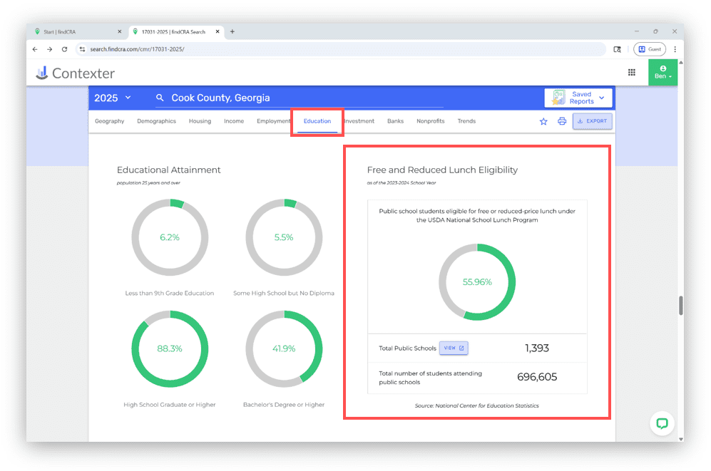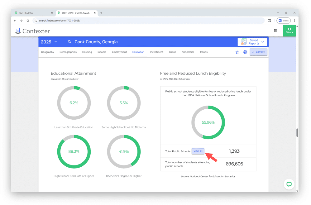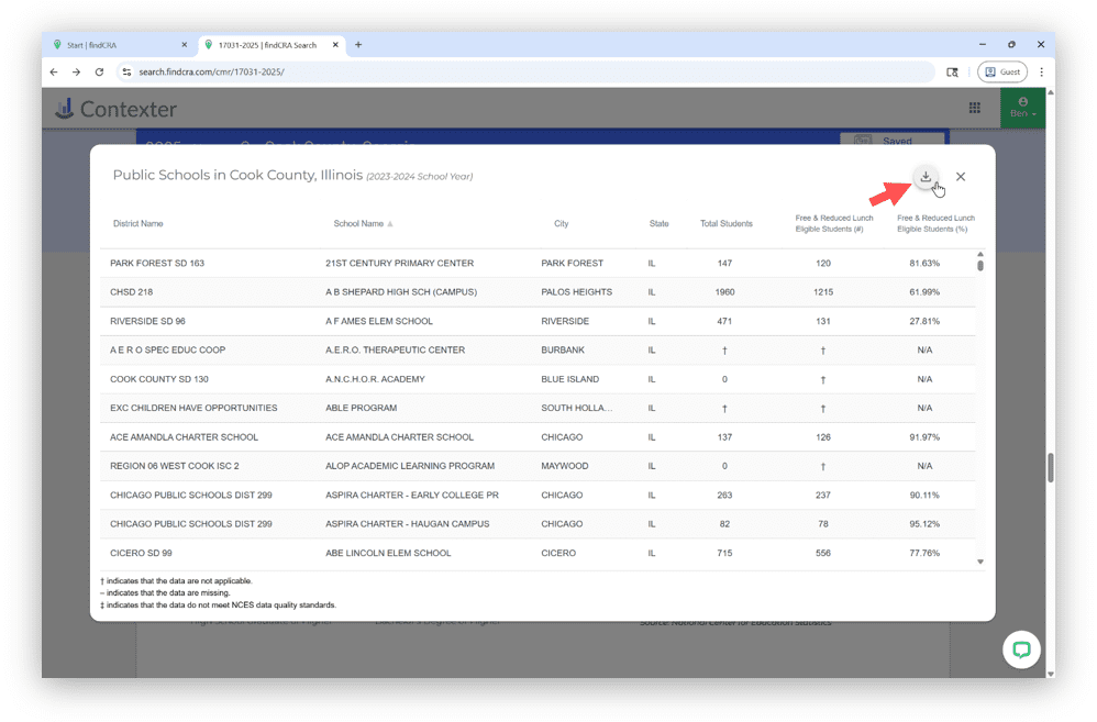 If you’re an approved user at a bank that has an active subscription to Contexter, you can log into findCRA and view or download public school data for any county in the nation. This article provides a detailed walk-through of how to access and export Contexter school data anytime, as well as an overview of the school data available.